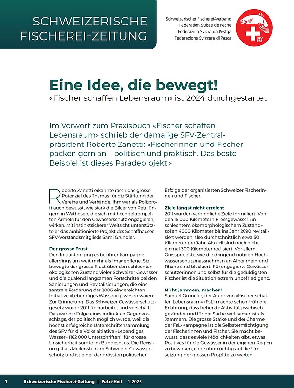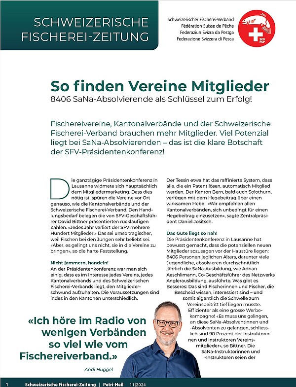 Die Schweizerische Fischerei-Zeitung SFZ informiert über aktuelle News aus dem SFV. Sie erscheint 11-mal jährlich, gedruckt in der Zeitschrift «Petri Heil» und digital für unsere Newsletter-Abonnenten.